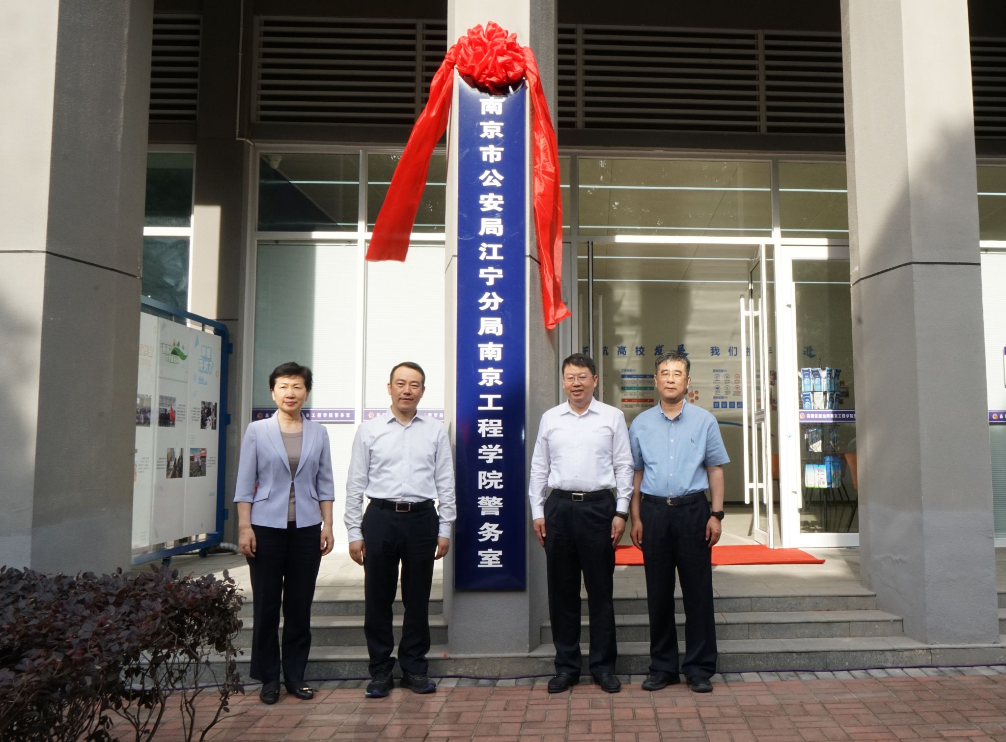5月29日下午,我校举行校园警务室揭牌仪式。省公安厅内保总队总队长赵居伦,市公安局副局长嵇艳霞,市公安局副局长、江宁区副区长、公安分局局长梅中亚,我校党委书记孙爱武出席仪式并为警务室揭牌。省公安厅内保总队,市公安局内保支队、人口支队,市各区公安分局领导、内保领导,驻宁各高校保卫处领导以及师生代表参与活动。仪式由党委常委、组织部部长、统战部部长聂邦军主持。