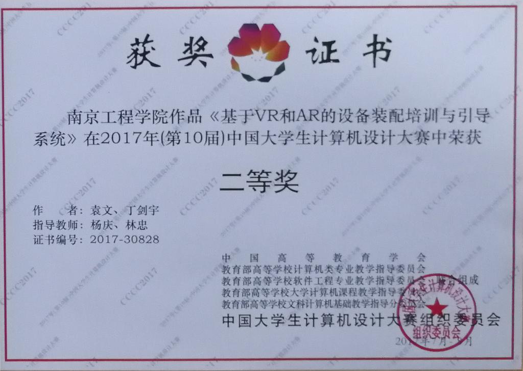 暑假期间,第十届中国大学生计算机设计大赛全国总决赛在安徽合肥举行。我校计算机凯发的袁文和丁剑宇同学在杨庆、林忠老师的指导下,制作的参赛作品《基于VR和AR的设备装配培训与引导系统》荣获了全国二等奖。