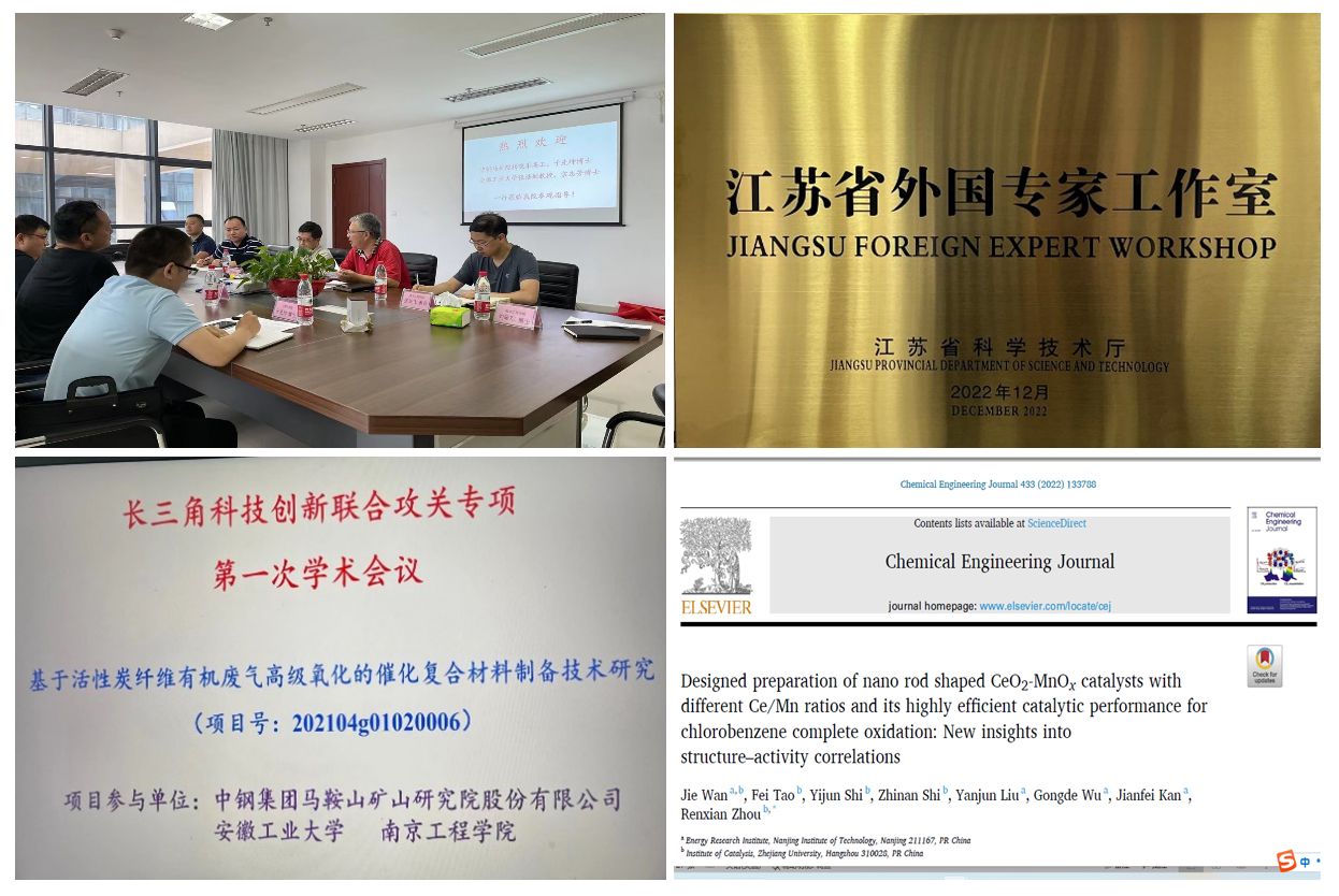 研究院在国家自然科学基金、江苏省自然科学基金、江苏省重点研发计划、长三角科技创新联合攻关专项、江苏省国际合作项目等11项资金的支持下,在VOCs的低碳净化、CO2低能耗捕集和高质转化、光催化水制氢气、数据推理算法、机器学习等前沿领域开展了基础研究;先后在Chem. Eng. J.(IF:16.7)、Fuel(IF:8.0)等学术期刊上发表高质量论文35篇,出版专著1部,申请国家发明专利25项(授权15项),获得省部级科技奖励2项,获批我校首个江苏省外国专家工作室。