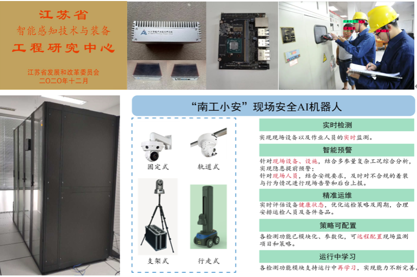 围绕信息融合与决策技术、先进感知与交互技术、智能感知装备集成技术打造智能感知技术与装备产业应用前沿阵地,为企事业单位的感知智能提供技术和产品服务。研究院建立了人工智能模块化机房,提高了大数据算法能力。在此基础上,先后开发了智能边缘计算盒子(AI BOX)、人员安规监测系统、烟火检测与报警系统、输送皮带偏移与撕裂检测系统、电力通道防外破系统、风电机舱智能巡检系统等软硬件系统,满足了能源电力行业运维智能化的急迫需求,减轻了一线运维人员的劳动负荷。目前已部署在苏州、南京等9个地市供电公司以及华电芜湖电厂、新疆布尔津风电场等运维现场,取得了很好的应用效果。现正规划开发以设备安检、人员安防、区域安控为应用方向的“南工小安”现场安全AI机器人。2020年,获批江苏省智能感知技术与装备工程研究中心。近3年来,为企业提供技术服务50余项,科研到账经费超过1800万元;转让发明专利3项,转让金额共84万元。专职青年教师中6人获批江苏省科技副总项目,积极推动江苏企业科技创新和产业高质量发展,获省“产学研合作项目”指导性计划立项支持4项。