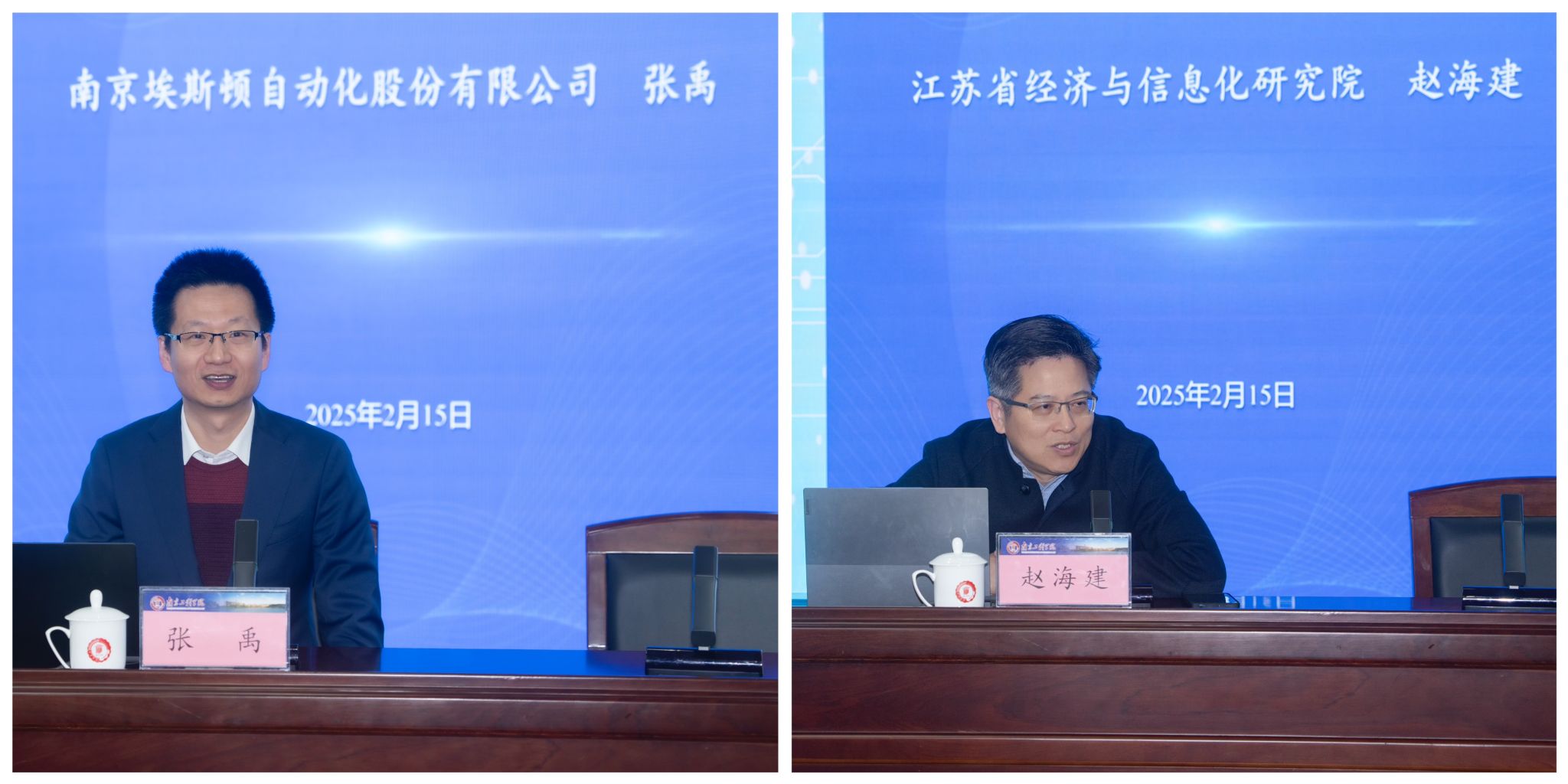 本次培训邀请了两位权威专家围绕人工智能技术前沿与产业转型趋势等作专题报告。工信部专家、埃斯顿自动化股份有限公司首席技术官张禹博士以《AI人工智能技术发展及其机器人应用》为题,从技术前沿、产业实践双维度切入,聚焦AI发展与技术演进、AI机器人具身智能的技术发展以及埃斯顿在“AI+机器人”融合应用中的探索,同时介绍了国产人工智能模型DeepSeek的发展与应用,为深入把握人工智能与机器人融合发展的新趋势提供了重要启示。江苏省经济和信息化研究院智能工厂专家赵海建以《当前产业转型升级趋势及对教育科技人才的影响分析》为题,系统阐释了以数字化转型、绿色化转型和人工智能驱动为核心的发展路径与趋势,深入剖析产业结构调整背景下的教育科技人才需求变革,并提出政策引导、企业协同与个人能力提升的“三位一体”发展框架,培养具备跨学科思维和数字化能力的“π型人才”,为校政企协同破解转型难题提供了指引。