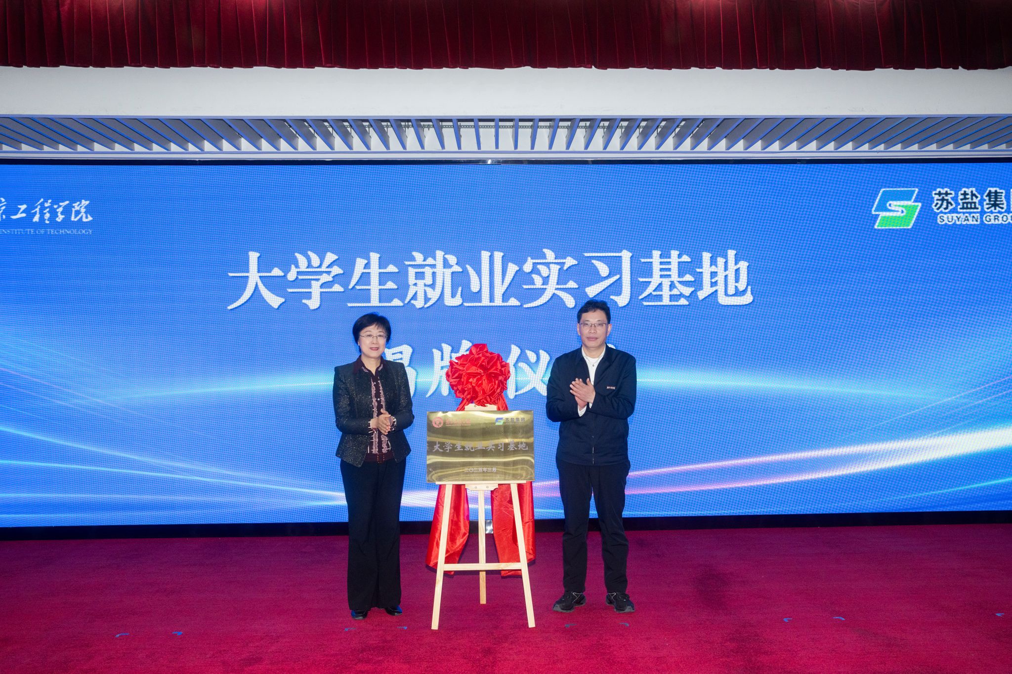 在与会人员的共同见证下,校企双方共同签订战略合作协议,并为“苏盐集团人才教育培训基地”和“大学生就业实习基地”揭牌。