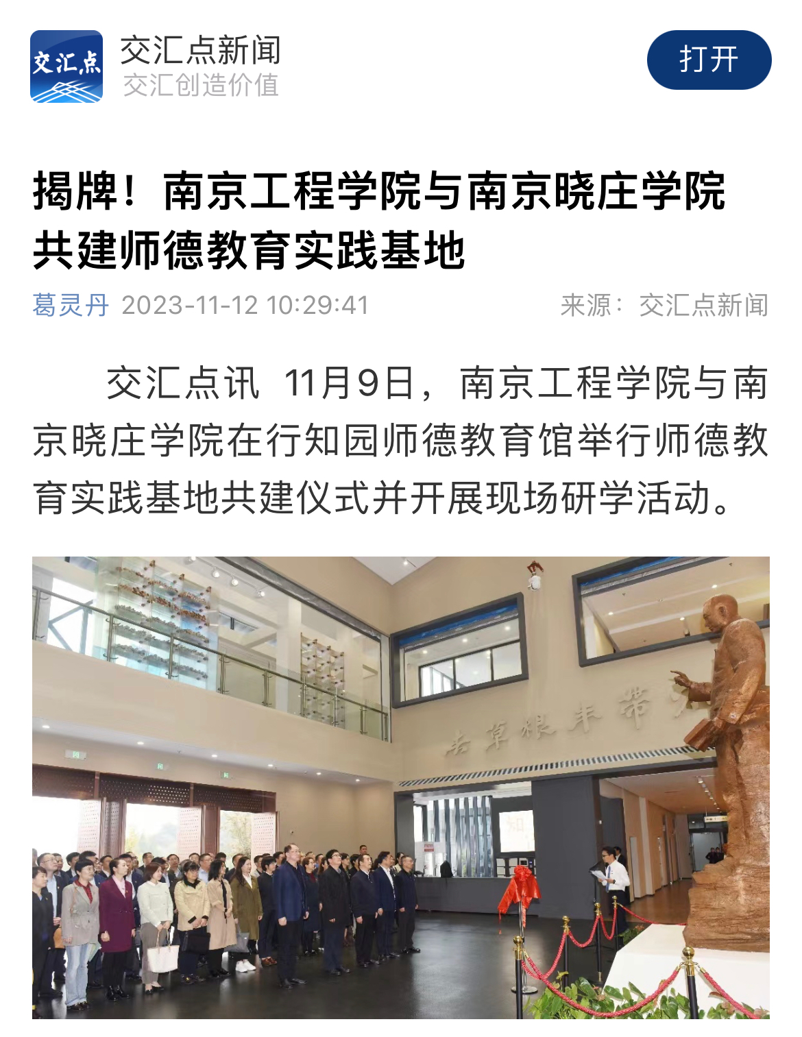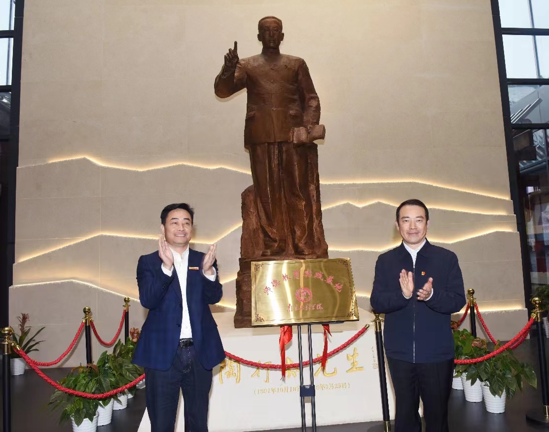 在师德教育馆内中央大厅陶行知先生的雕像前,凯发k8官网党委书记孙爱武与南京晓庄学院党委副书记、校长张志华共同为师德教育实践基地揭牌。