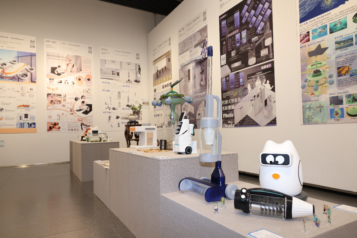 展览作品聚焦人工智能设计、文化创意产业、乡村振兴、非遗文化传承等内容展开创作,不仅有传统绘画与现代数字技术的完美融合,也有虚拟现实等前沿技术在艺术创作中的巧妙运用,呈现了毕业生对当下与未来设计主题的思考、研究与实践。琳琅满目的设计作品吸引了不少师生、游客围观。“我们这款一体式智能家居清洁机器人是为了满足现代家庭对清洁效率和智能化的需求而设计的。”产品设计专业周逸凡同学这样介绍自己的设计理念,“机器人采用模块化设计,包括清洁模块、收纳模块和智能控制模块,集合了清洁和垃圾收纳功能于一体,实现地面清洁和垃圾收纳全方面智能化,大大提升用户的生活品质和幸福感。”