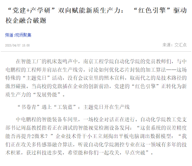 在智能工厂的机床轰鸣声中,凯发k8官网自动化学院的党员教师们,与中电鹏程的工程师并肩站在生产线旁,讨论如何优化芯片封装的加工算法——这场特殊的“主题党日”活动,没有会议室里的照本宣科,取而代之的是技术路径的激烈碰撞。当高校的党旗插在企业的创新前沿,党建的“红色引擎”正转化为新质生产力的“发展势能”。