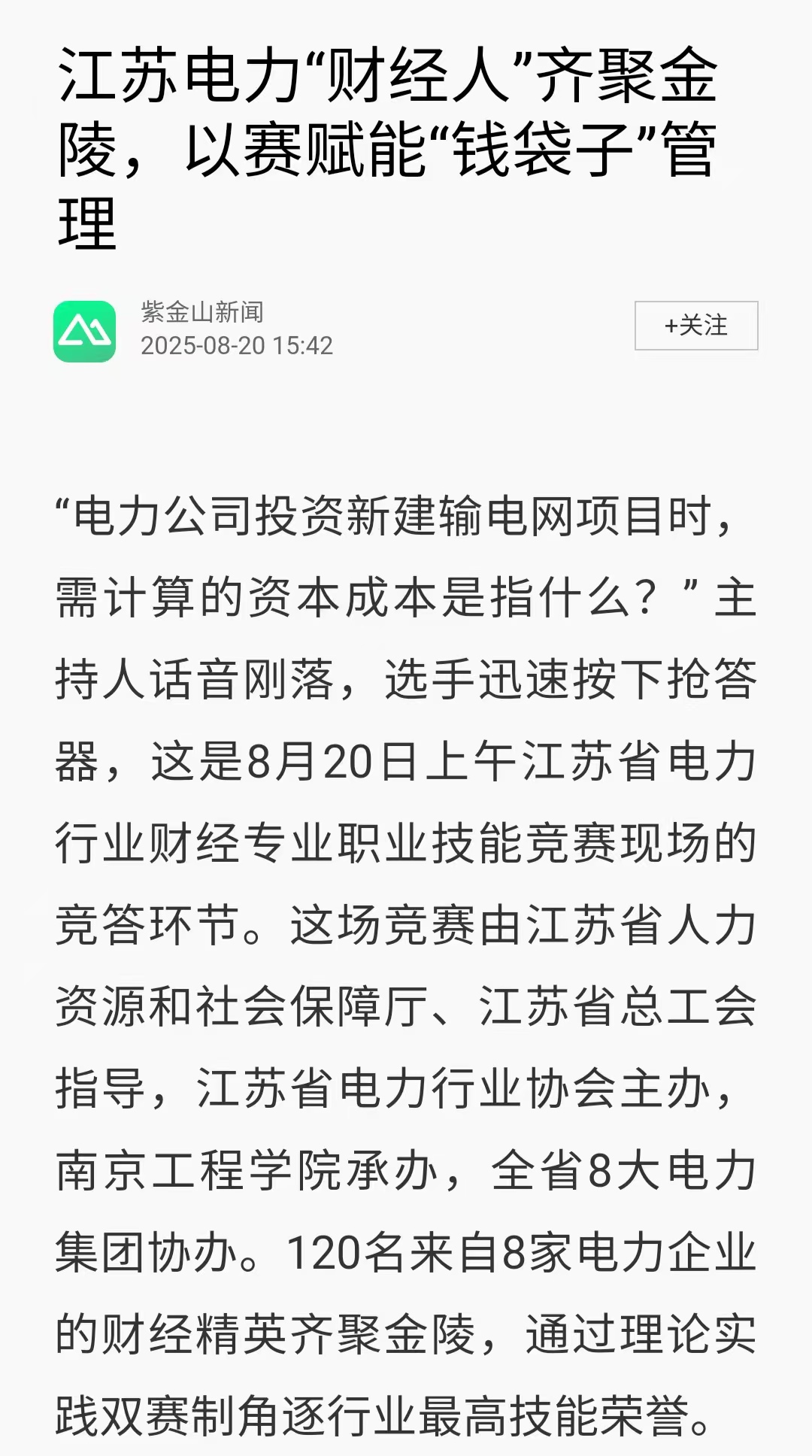 《紫金山新闻》:江苏电力“财经人”齐聚金陵,以赛赋能“钱袋子”管理