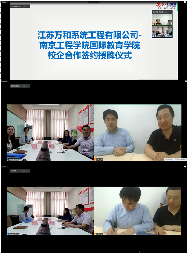 为使学生更好地适应企业的需求,拓展实习、实践与就业渠道,7月7日下午,国际教育学院与江苏万和系统工程有限公司通过腾讯会议线上平台举行了校企合作“云”签约授牌仪式,签订合作框架协议,并建立了社会实践基地和大学生就业基地。