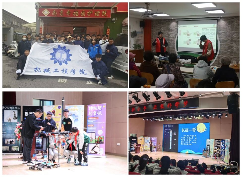 “实”字为重,志愿服务显担当。各团支部积极将所学所思转化为实际行动,开展校内外志愿服务,主动承担社会责任,展现青年力量担当。机电类2301团支部前往南京幸福园护理院,清洁卫生环境,与老师闲话家常,并为他们表演了自己创作的小短剧。机电221团支部走进紫鑫城社区,开展了电路应急知识的科普宣传活动,指导社区居民建立起安全用电的正确理念。机电222团支部跟随机械凯发科创团队“小种子”成长计划来到南京市齐武路小学,开展科普活动进校园活动,带领小学生们一起发射火箭飞行器模型、放飞飞机模型,亲手操作模型小车、3D打印机等,真正零距离“触摸”科技的神奇。