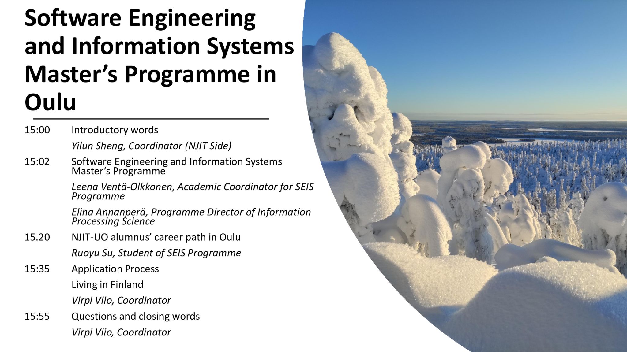 宣讲会上,奥卢大学Leena Vent?-Olkkonen副教授和Elina Annanper?副教授先后介绍了奥卢大学软件工程和信息系统研究生项目的招生基本情况和我校学生申请奥卢大学研究生的优惠措施;奥卢大学Virpi Viio女士重点对奥卢大学研究生项目申请流程进行讲解,介绍了奥卢市的学习、生活环境,并为计划申请奥卢大学研究生的同学们提供了实用的课外活动小贴士;我校中芬项目校友、目前正在奥卢大学攻读硕士学位的2022届毕业生苏若愚分享了在奥卢大学精彩纷呈的学习生活及未来的职业规划。提问环节,四位主讲人与学生通过线上形式互动交流,热情回答了同学们提出的考试准备、出国留学、学术研究等方面的问题。