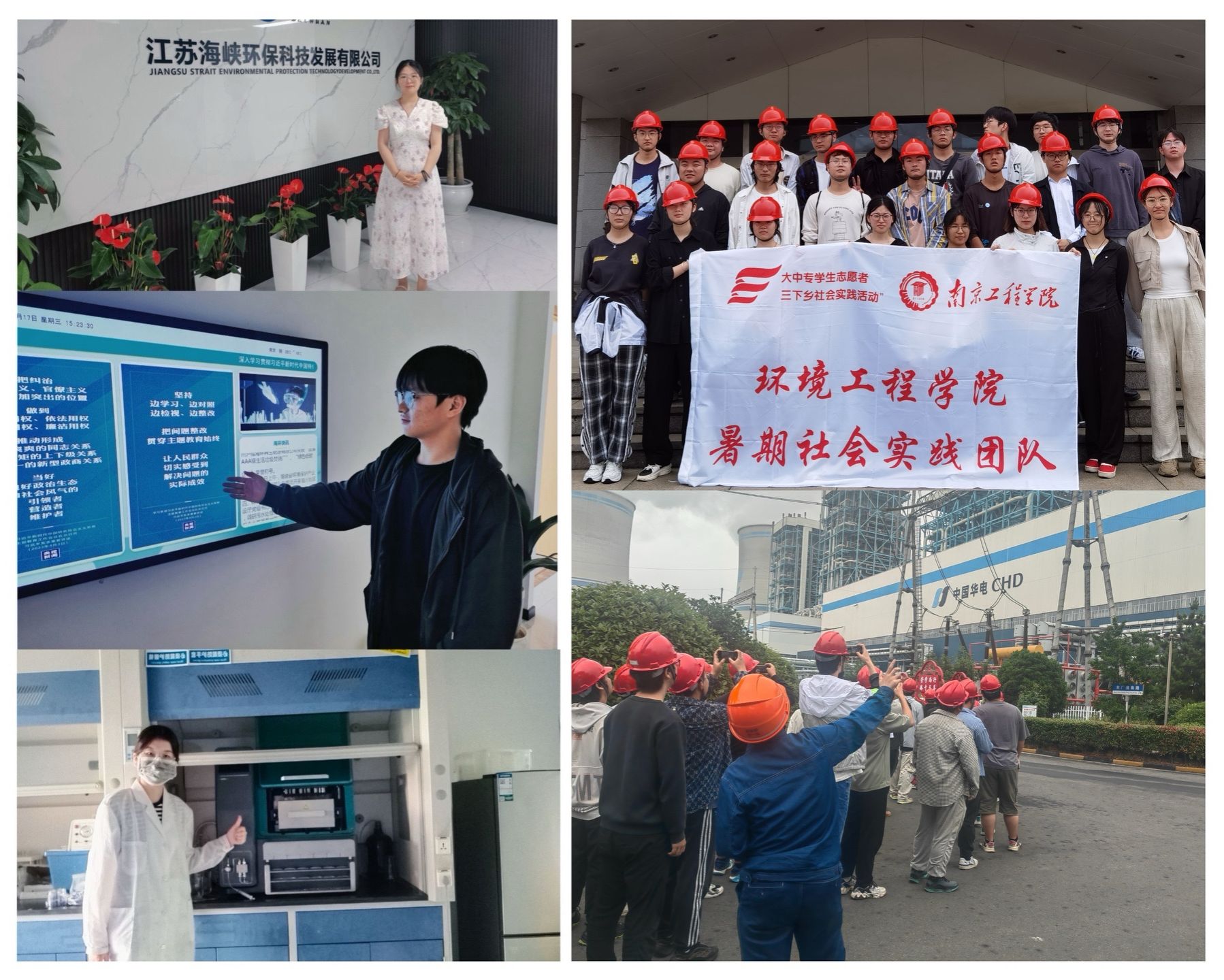 在华电江苏能源有限公司句容发电厂,团队成员了解了该电厂的发展史,参观了发电厂房、锅炉房、吸收塔、脱硫脱硝设备、煤仓以及火电机组碳捕集等设备,完善的废水处理系统和垃圾处理系统让同学们认识到企业在节能减排、清洁生产等方面所做的不懈努力;在江苏海峡环保科技发展有限公司,同学们围绕污水处理、生态修复等核心领域,与资深工程师并肩作战,通过参与技术研讨、现场调研、数据分析等工作,深入了解环保技术的最新成果及其在改善环境质量方面的重要作用;在南京爱迪信环境技术有限公司,同学们深入了解其在水、气、声、渣等领域的环境监测和环境检测技术,全方位了解环保技术的最新动态与应用实践,并参与到实际项目中,亲身体验从方案设计到实施落地的全过程,不仅加深了对环保技术的理解,更培养了解决实际问题的能力和团队合作精神,增强了对环保事业的使命感和责任感。