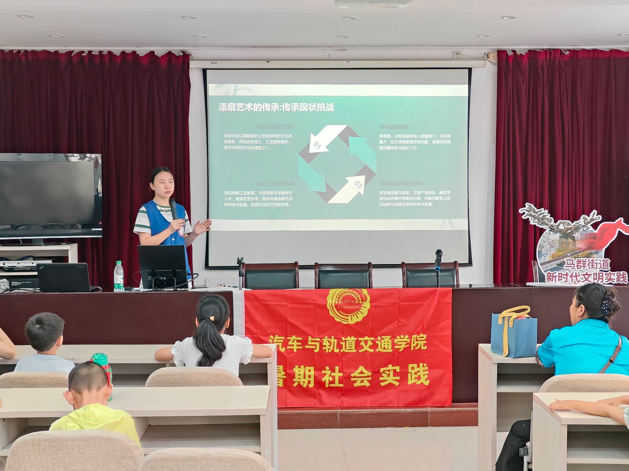开展社区宣传,彰显青年担当。实践团成员深入马群街道润康苑社区、泰山街道桥北社区广泛开展主题宣讲活动,为传承和弘扬传统文化贡献青春力量。活动现场,实践成员化身为云锦文化的传播使者,手捧精美的云锦样品,以生动的语言和互动的方式,向社区居民详细介绍了云锦的历史渊源、独特工艺及艺术价值,激发了在场居民对传统文化的浓厚兴趣与保护意识。
